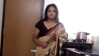 Indian Step-mom Disha Kitchen Striptease & Fucked by Stepson